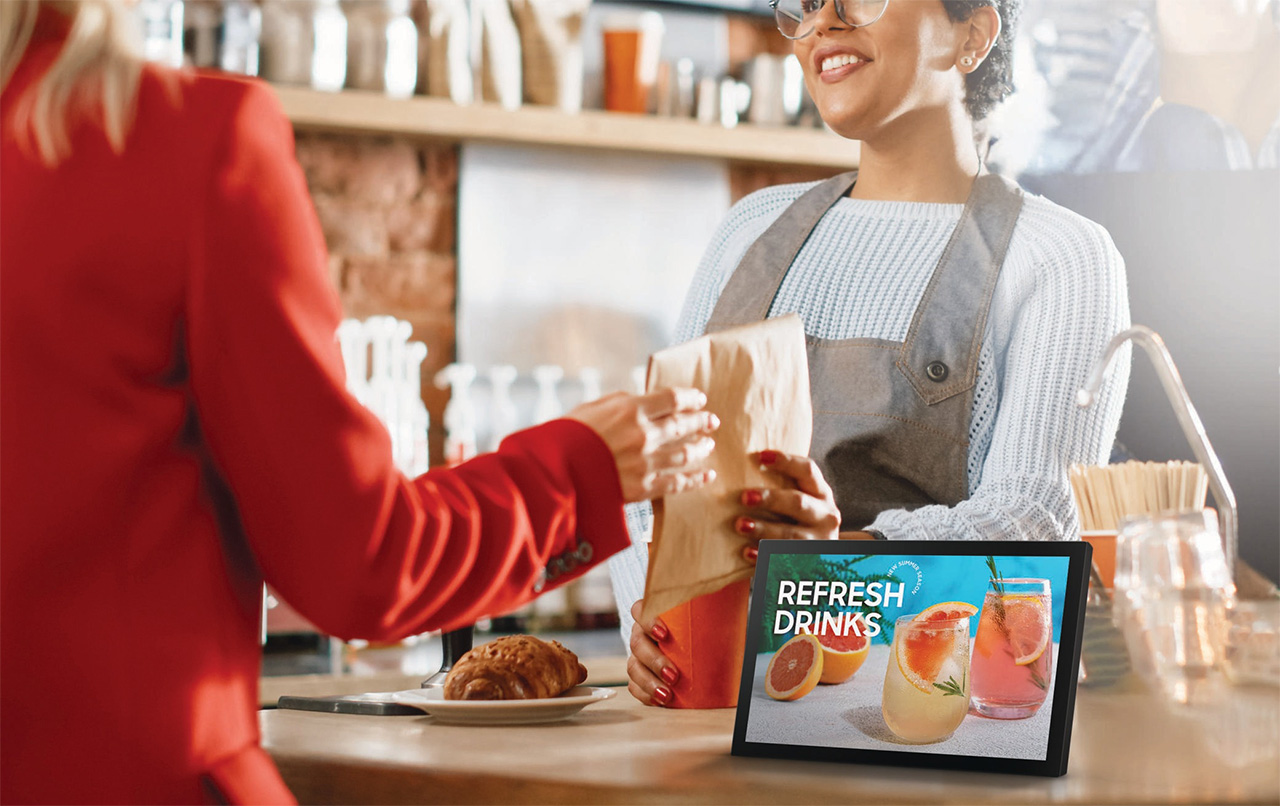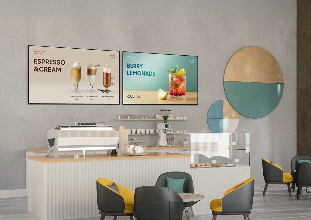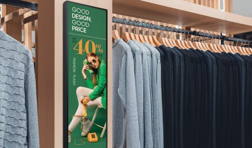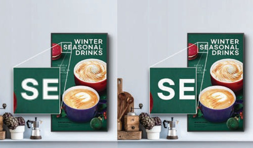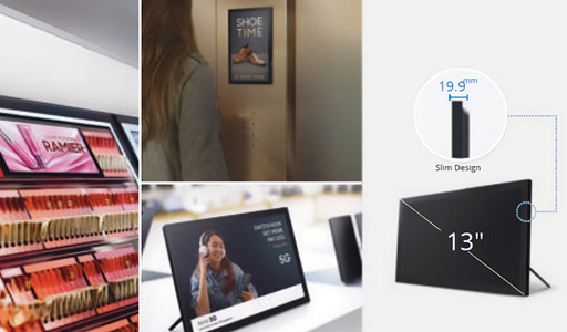 A 13 hüvelykes Small Signage kijelző mindössze 19,9 mm-es vékony kialakításával könnyedén elhelyezhető olyan szűk helyeken, ahol a nagyobb kijelzők nem praktikusak. Kompakt mérete egyszerűbbé teszi a telepítést és a tartalomkezelést, így ideális választás olyan ügyfélközeli területeken, ahol az információkat közelről kell megjeleníteni.
