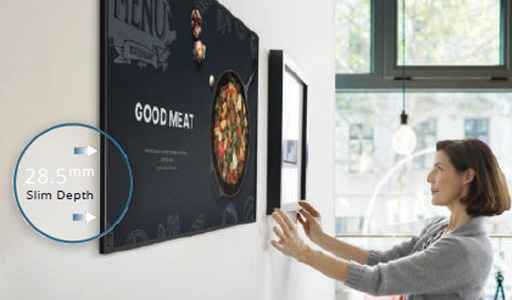 A Small Signage kijelzőt kifejezetten a helyszűkében lévő környezetek hatékony kihasználására tervezték. Letisztult hátlapi kialakítása ideálissá teszi falra szereléshez, miközben a csatlakoztatás, a tartalomlejátszás és az eszközvezérlés egyszerűen kezelhető.