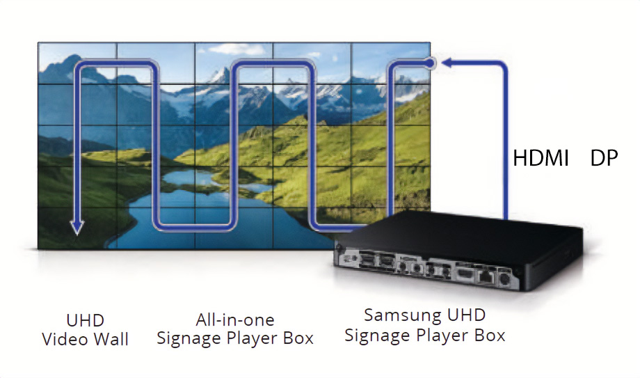 A DP1.2 és HDMI portokon keresztüli daisy chain kapcsolattal a Samsung Video Wall akár 5×5-ös konfigurációban is képes UHD tartalom megjelenítésére több kijelzőn. Az ISTAtanúsított csomagolás a szállítás közbeni